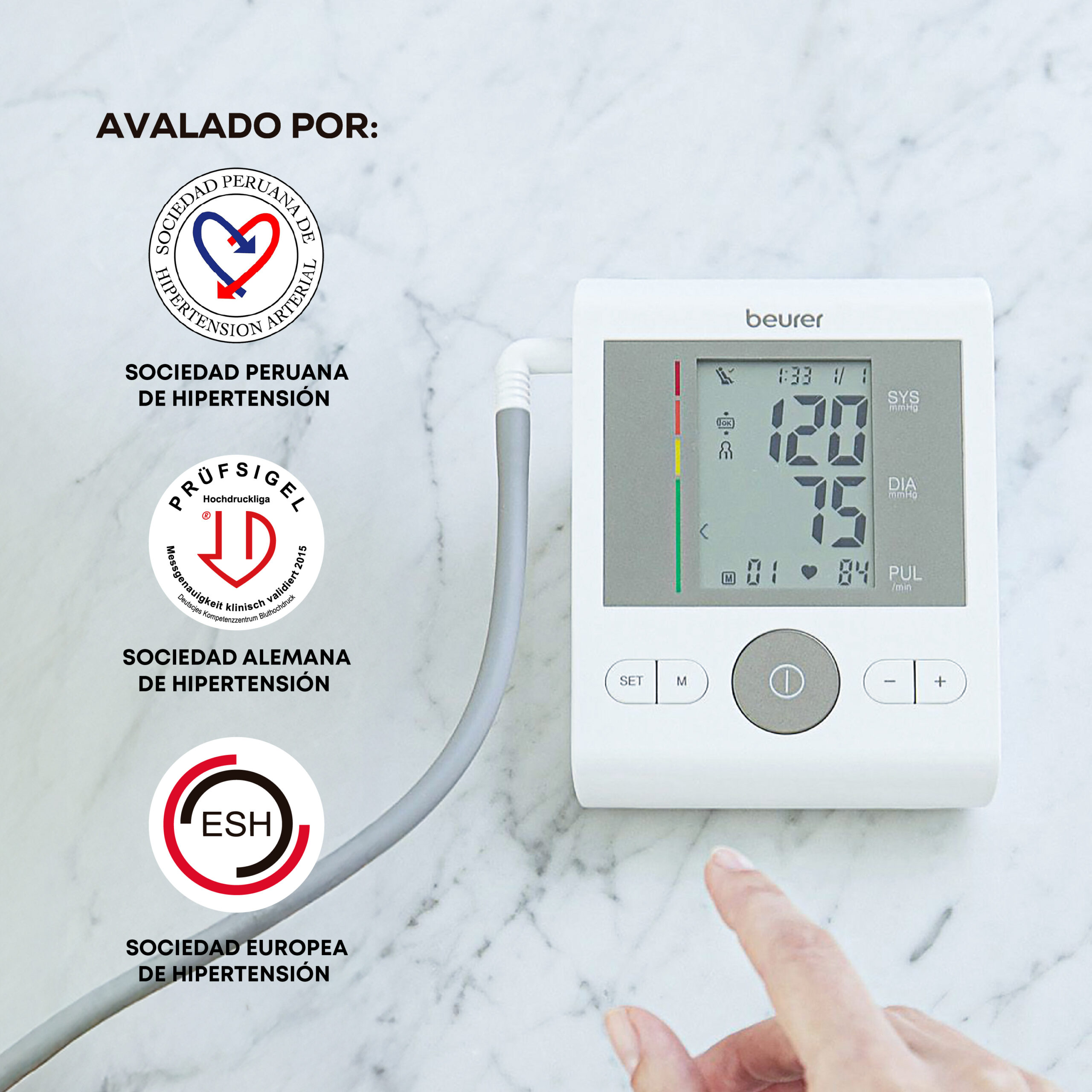 El tensiómetro de brazo BM28 de Beurer cuenta con función alarma, ajustable en dos tiempos, y proporciona la fecha y la hora. Tiene 4 x 30 mediciones de memoria para que 4 usuarios puedan almacenar sus valores de medición; detector de arritmias y tabla de registro de la tensión sanguínea. Cuenta con una gran pantalla de fácil lectura que clasifica los resultados de la medición en una escala de colores e inicia y acaba la medición del pulso y la presión arterial automáticamente. Indica errores e incluye una guía para la correcta colocación del brazalete.